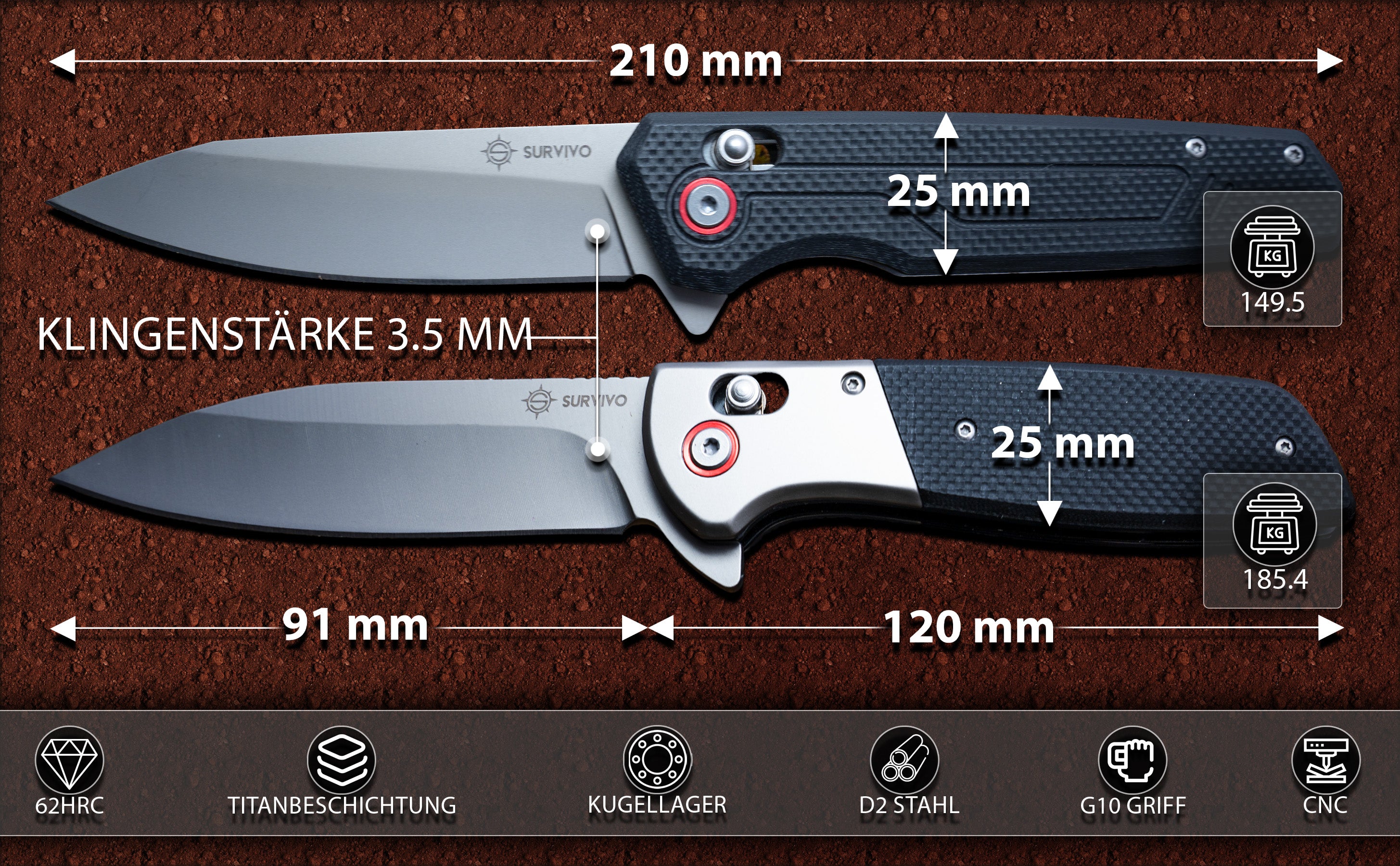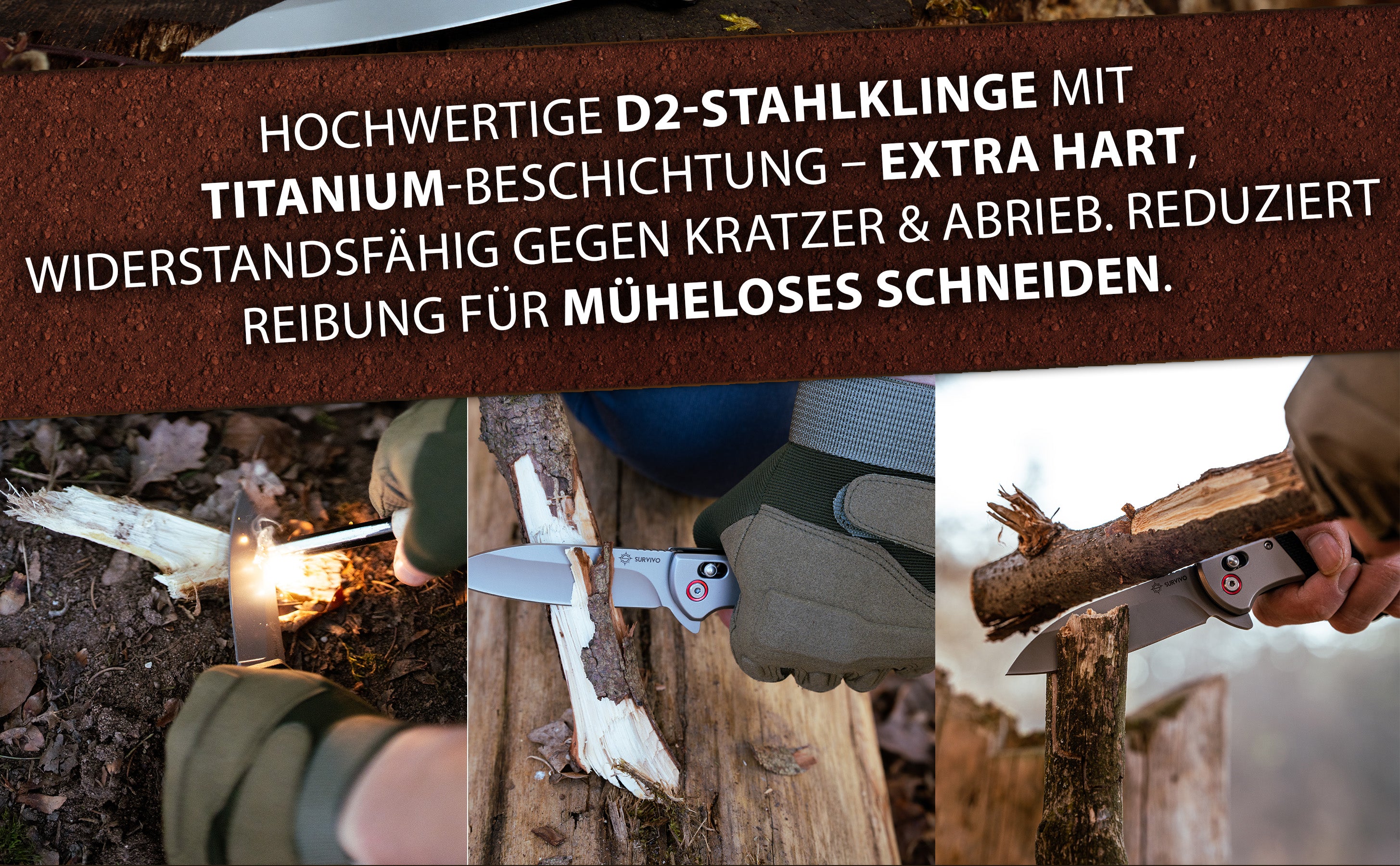 - Titanbeschichtete D2-Stahlklinge – besonders langlebig & scharf
